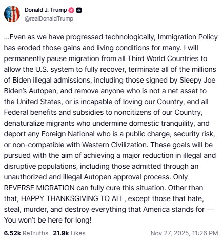 Casi a la medianoche del jueves, Día de Acción de Gracias, Trump emitió un agresivo mensaje asegurando que suspenderá de manera permanente la inmigración de todos los países del tercer mundo, eliminará todos los beneficios y subsidios federales para los no ciudadanos, y desnaturalizará a los inmigrantes que socaven la tranquilidad nacional.
