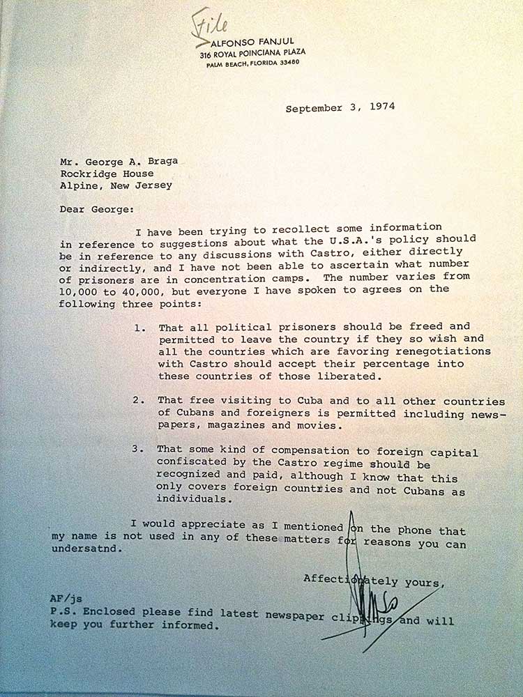 Repaso esta carta de la Colección de los Hermanos Braga, Sección de Estudios Especiales de la Biblioteca Smathers, en la Universidad de Florida, porque resulta ilustrativa. Está fechada el 3 de septiembre de 1974 y fue enviada por el magnate azucarero Alfonso Fanjul y Gómez Mena a su primo también influyente empresario George Braga. No hay que darle muchas vueltas para entenderla como parte de la estrecha conexión entre la política de Washington hacia Cuba y el poder de la élite más acaudalada de la nación, en este caso cubanoamericana.