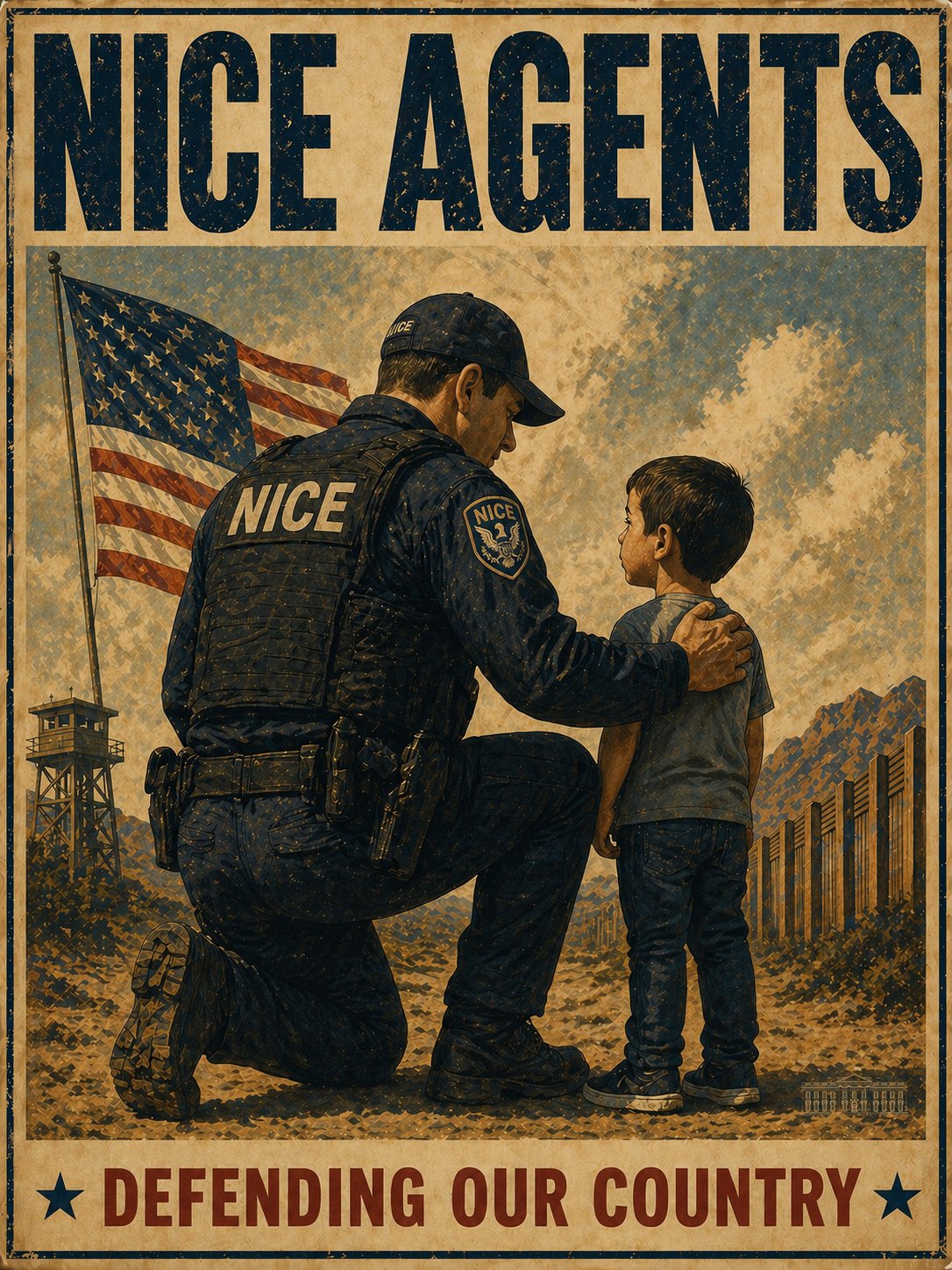 La Casa Blanca posteó en X un cartel con un agente de N-ICE, encorvado con una rodilla en tierra mientras trata amablemente a un niño. El lema que lo encabeza dice: “Servicio Nacional de Inmigración y Control de Aduanas. ¡Hagámoslo!”