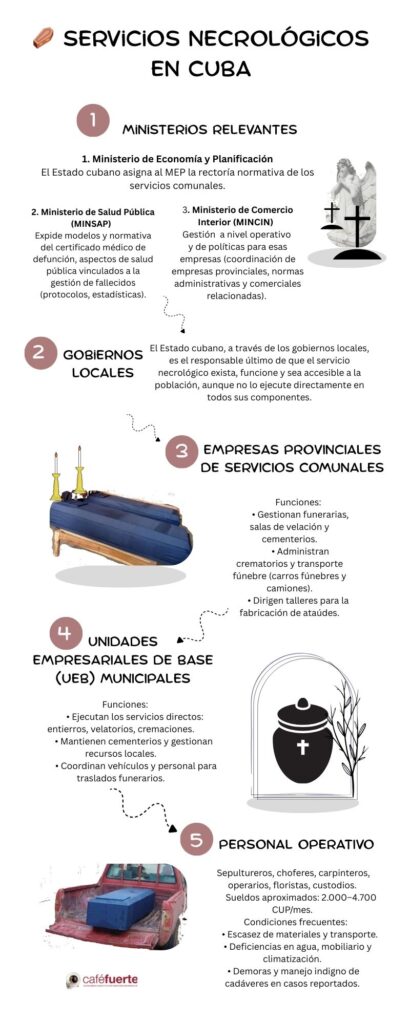 A la combinación de envejecimiento acelerado, disminución de nacimientos, emigración masiva y colapso sanitario se suman un sistema de servicios necrológicos que opera con escasos recursos —cuyo monto se desconoce—, un transporte deficiente y materiales de baja calidad. Esto implica un riesgo biológico aún no abordado en Cuba.