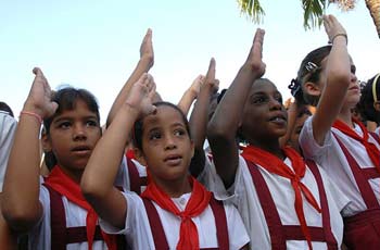 En la escuela cada mañana se hacía una referencia al Che, ciertamente perturbadora para un niño, tras abandonarlo en todos los flancos como persona incómoda que se iba convirtiendo cada vez más en los años sesenta, en parte por la coherencia, el trabajo voluntario, la austeridad, en parte por desarrollar la idea de la industrialización con experiencias como la autogestión de las empresas que practicase Tito en Yugoslavia, con el fin de la no dependencia total de la URSS ni de otra potencia, y en parte por la crítica “in crescendo” al abandono del Internacionalismo proletario precisamente de la URSS, el contraste del profundo suspiro que le significó a Fidel Castro y buena parte de la cúpula cubana la desvinculación del Che del gobierno de Cuba, con la utilización que como excelentes totalitarios, supieron darle a su imagen una vez muerto, utilizaciones de su figura entre las cuales se enmarcan ese lema cada mañana en el colegio: “Pioneros por el comunismo, seremos como el Che”, que nunca explicó a que e referían a ser como el Che, ya que ser como el Che implicaba una rebeldía a la que de ningún modo invitaban en las escuelas cubanas, sino a su opuesto.