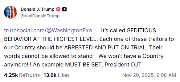 «Esto se llama CONDUCTA SEDICIOSA DEL MÁS ALTO NIVEL», afirmó Trump en una publicación en la red Truth Social. «Cada uno de estos traidores a nuestra patria debe ser ARRESTADO Y JUZGADO. No podemos permitir que sus palabras queden impunes. ¡No tendremos país! ¡Hay que dar ejemplo!».